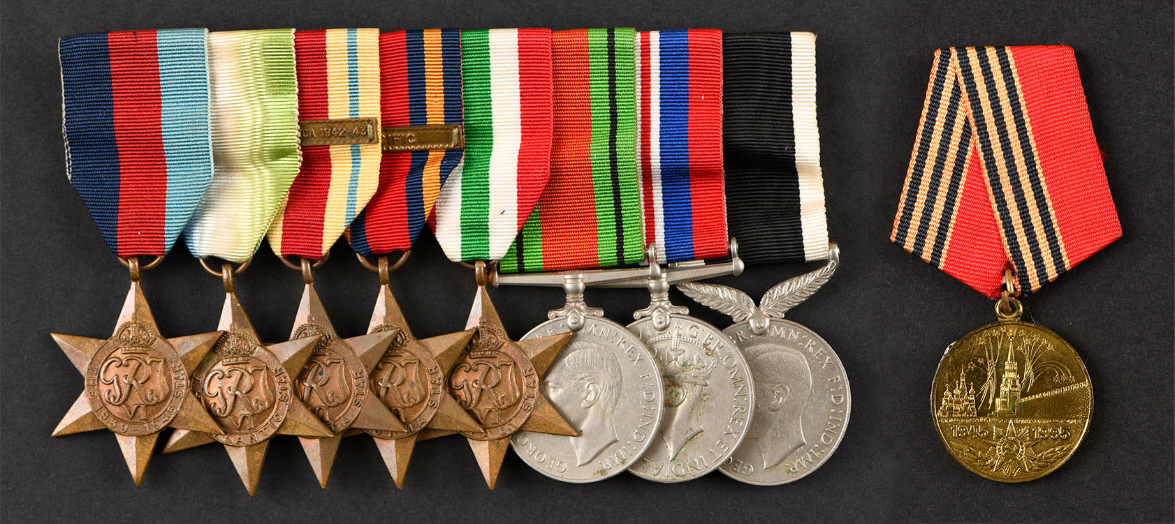 The 1939-45 Star is the first in a series of eight campaign stars instituted in 1945 to recognise service in World War Two. The ribbon has three equal vertical stripes of dark blue, red and light blue. The dark blue stripe symbolises the service of the Navy and the Merchant Navy, the red stripe symbolises the service of the Army, and the light blue stripe symbolises the service of the Air Force. The equal width bands represent the equal contributions of the three service arms towards victory. The ribbon was devised by King George VI. Two clasps could be awarded with this medal: ‘Battle of Britain’ and ‘Bomber Command’. Only aircrew would qualify for these clasps although a small number of Fleet Air Arm naval pilots flew for the air force and would be eligible for the ‘Battle of Britain’ clasp.