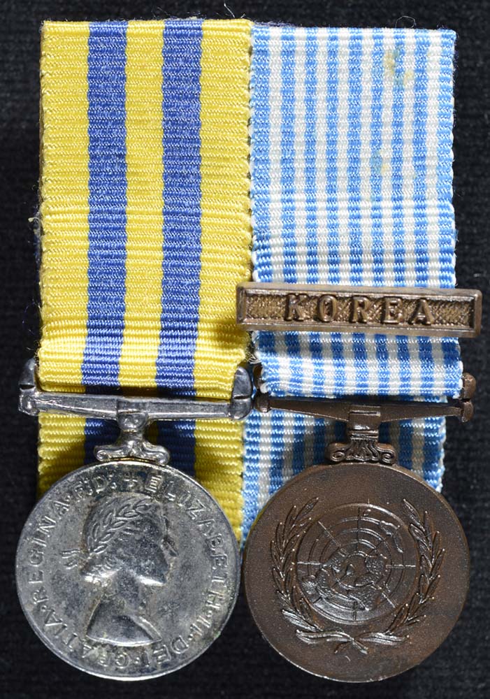 The United Nations Medal (Korea) was awarded for service during the Korean War and the year following the armistice (July 1950 to July 1954). It was the first international award created by the United Nations and features the UN emblem of a projection map of the world between two olive branches. The medal recognises the service of all military troops participating as part of the UN forces in Korea and was manufactured in the language of each country. It was also awarded to a limited range of civilians whose organisations were certified by the United Nations Commander-in-Chief as having directly supported military operations in Korea between 1950 and 1954.