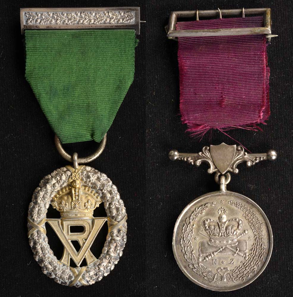 Instituted in 1887 as the New Zealand Volunteer Long and Efficient Service Medal. It was awarded to non-commissioned officers and soldiers of the New Zealand Volunteer and Permanent Militia Forces upon completion of 16 years continuous service. The ribbon was originally plain crimson, but two central white stripes were added in 1917.