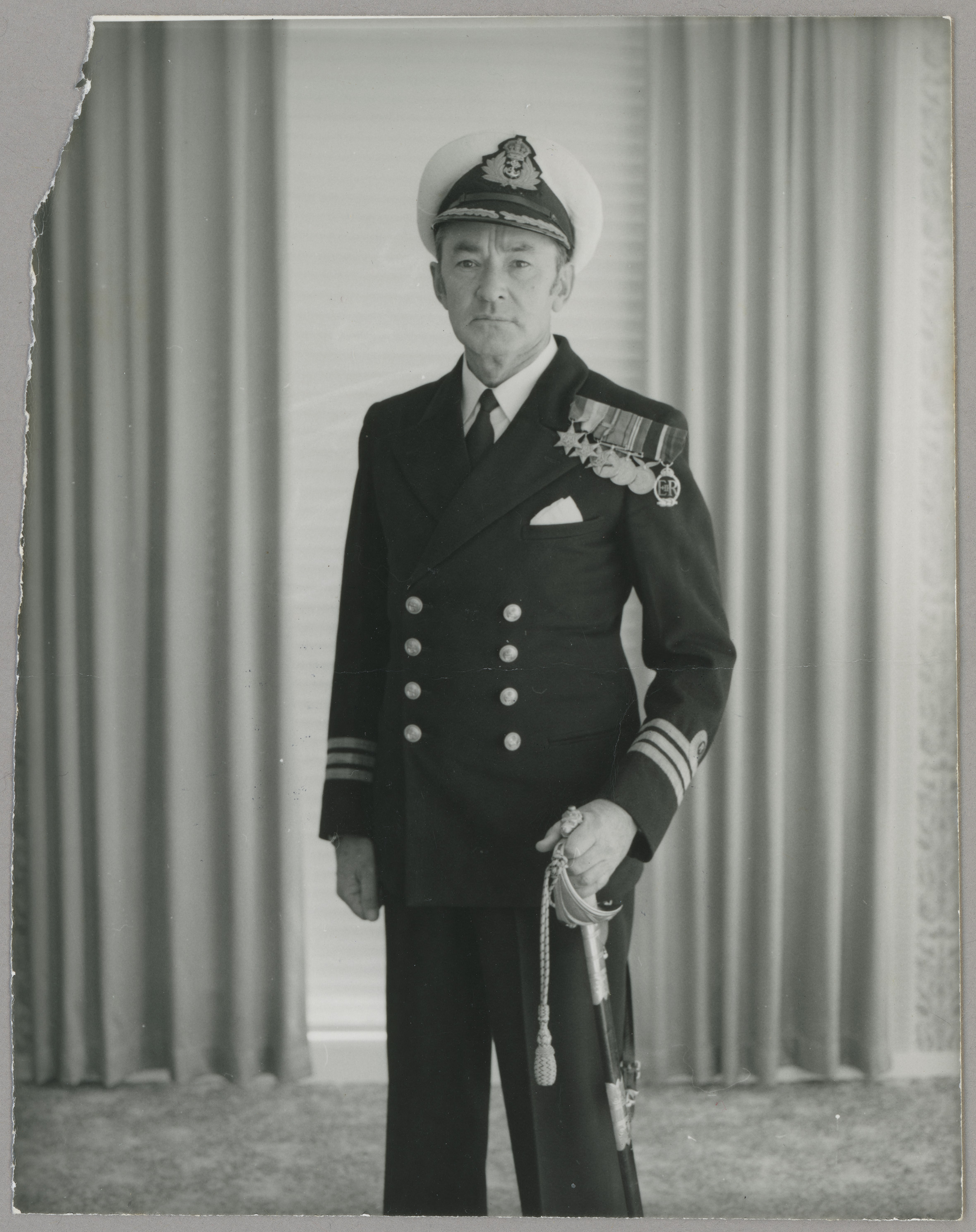 Thomas McFlinn originally joined the Army, training with the New Zealand Artillery 9th Heavy Regiment in November of 1940. He served at Motutapu Camp for six months before transferring to the Royal Navy as a Supply Officer. During the Second World War, McFlinn served in HMS Glasgow which took part in the Russian Convoys that took vital supplies of food and military equipment to Northern Russia. He also served in HMNZS Gambia later in the war with the British Pacific Fleet in operations around the Pacific and Japan. In 1947 McFlinn joined the Auckland Division of the Royal New Zealand Naval Volunteer Reserve (RNZNVR). He would be a member of the RNZNVR for the next thirteen years. Over that time, McFlinn was attached to HMNZS Ngapona and undertook training several times in HMNZS Bellona. He was awarded the Royal Navy Volunteer Decoration in 1957, the same year he reached the rank of Commander. He retired from the RNZNVR in 1960 after twenty years of service.