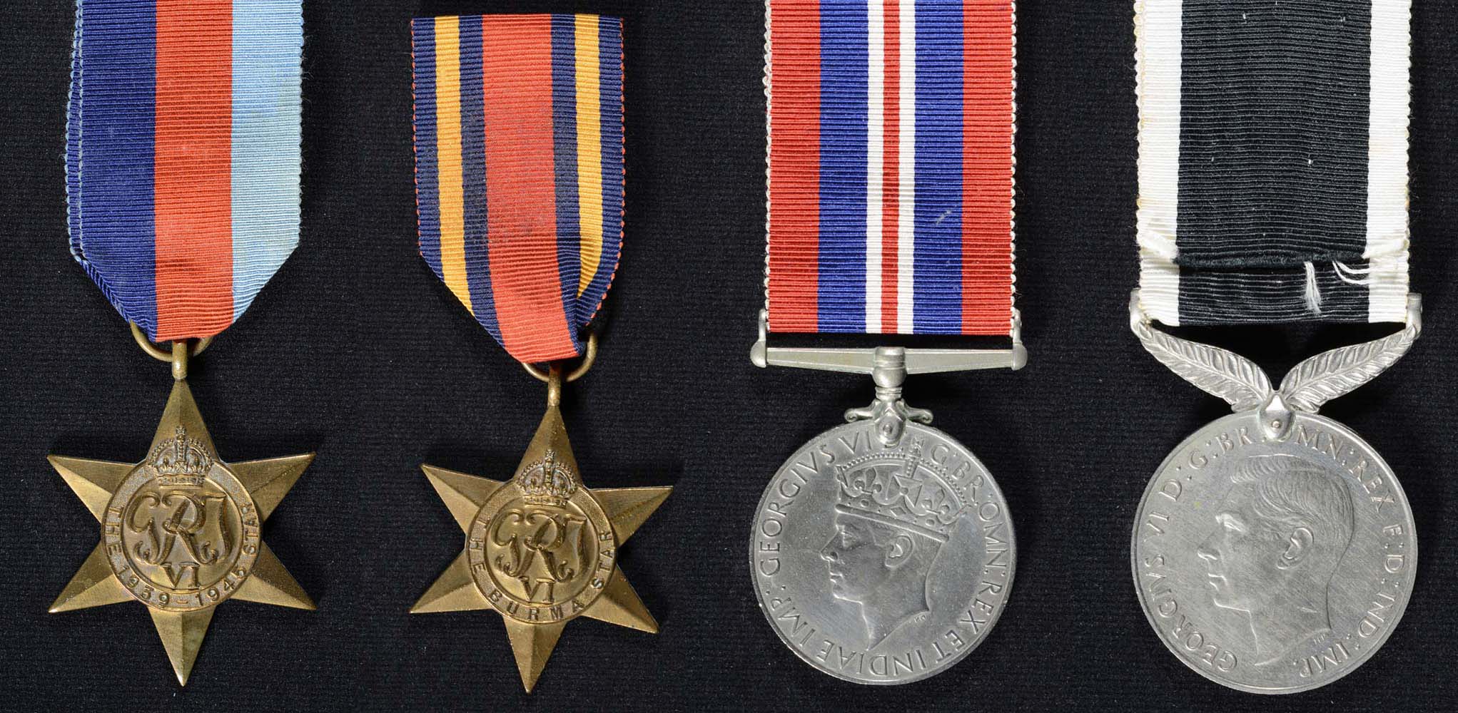 The Burma Star was awarded for service in the Second World War in the Burma campaign, from 11 December 1941 to 2 September 1945. The centre of the ribbon is red (representing the Commonwealth forces) with outer stripes of dark blue (representing the British forces). The dark blue bands each have at their centres a stripe of bright orange (symbolising the sun). A ‘Pacific’ clasp could be awarded with this medal. Personnel qualifying for both the Pacific and Burma Stars were awarded the first star but only a clasp in respect of the second.
