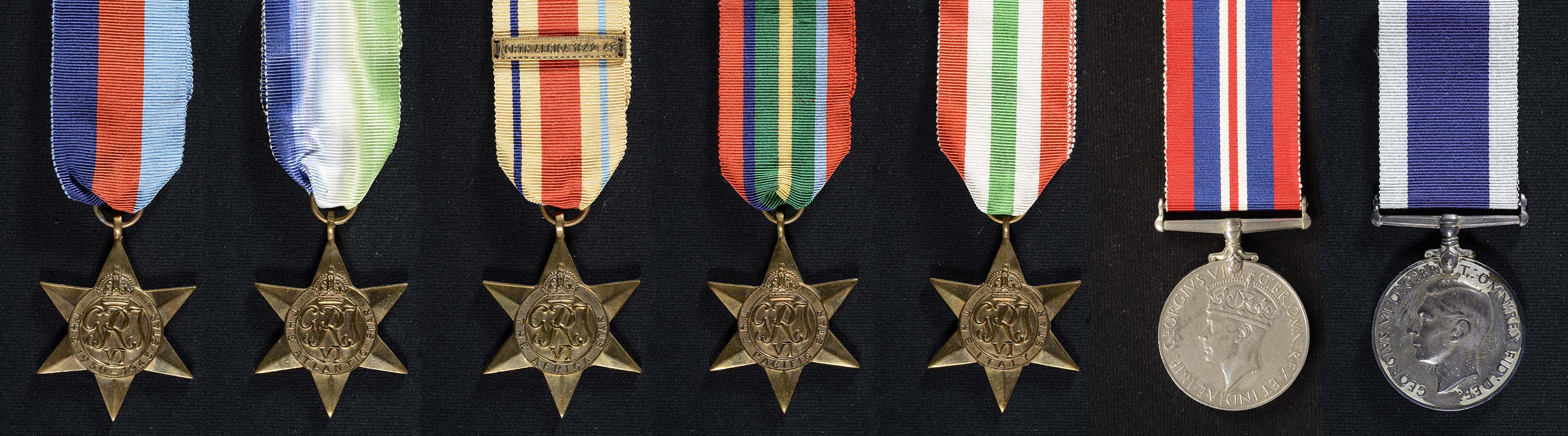The 1939-45 Star is the first in a series of eight campaign stars instituted in 1945 to recognise service in World War Two. The ribbon has three equal vertical stripes of dark blue, red and light blue. The dark blue stripe symbolises the service of the Navy and the Merchant Navy, the red stripe symbolises the service of the Army, and the light blue stripe symbolises the service of the Air Force. The equal width bands represent the equal contributions of the three service arms towards victory. The ribbon was devised by King George VI. Two clasps could be awarded with this medal: ‘Battle of Britain’ and ‘Bomber Command’. Only aircrew would qualify for these clasps although a small number of Fleet Air Arm naval pilots flew for the air force and would be eligible for the ‘Battle of Britain’ clasp.