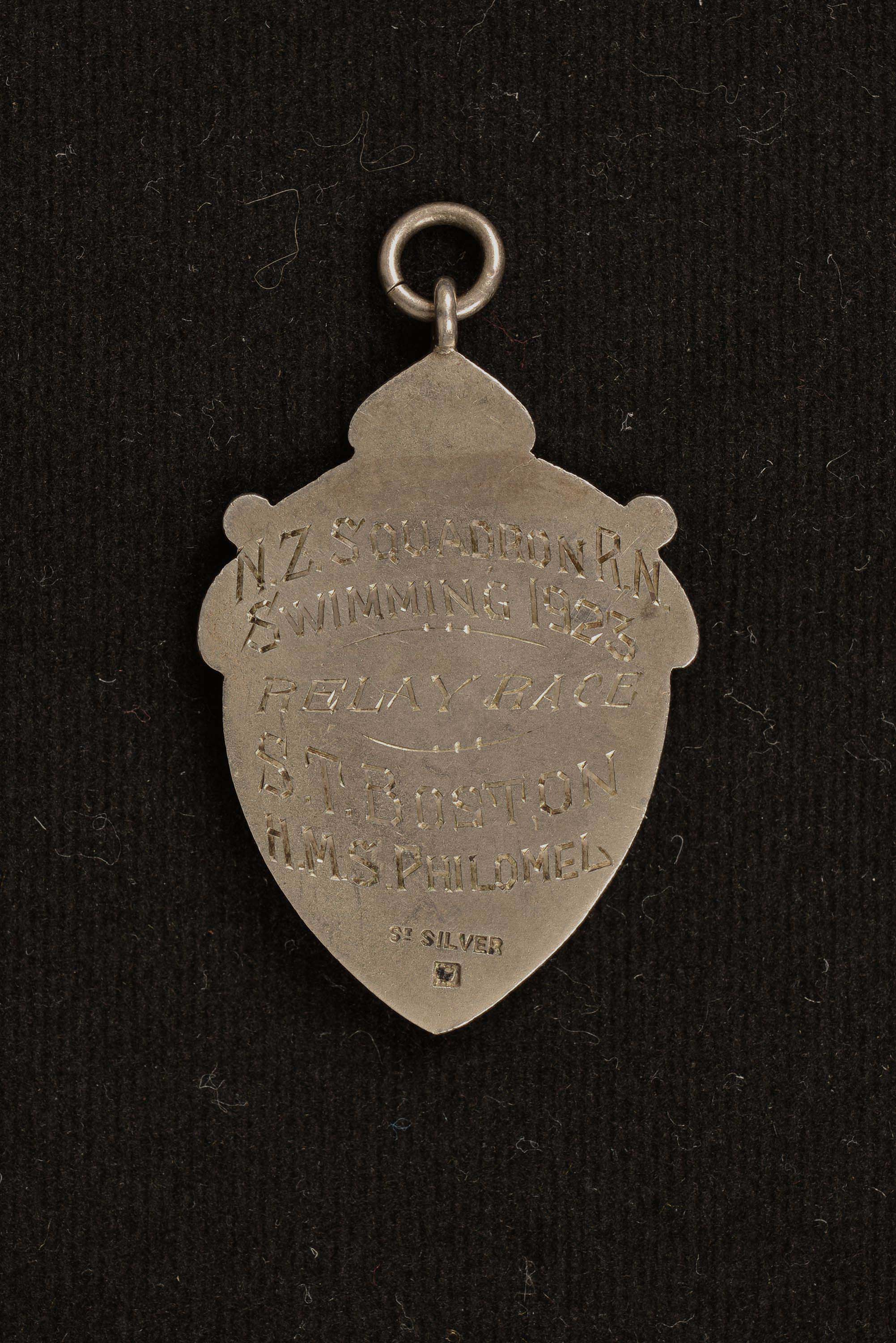 Silver medallion awarded to HMS Philomel for the NZ Squadron Royal Navy Swimming Relay Race in 1923.