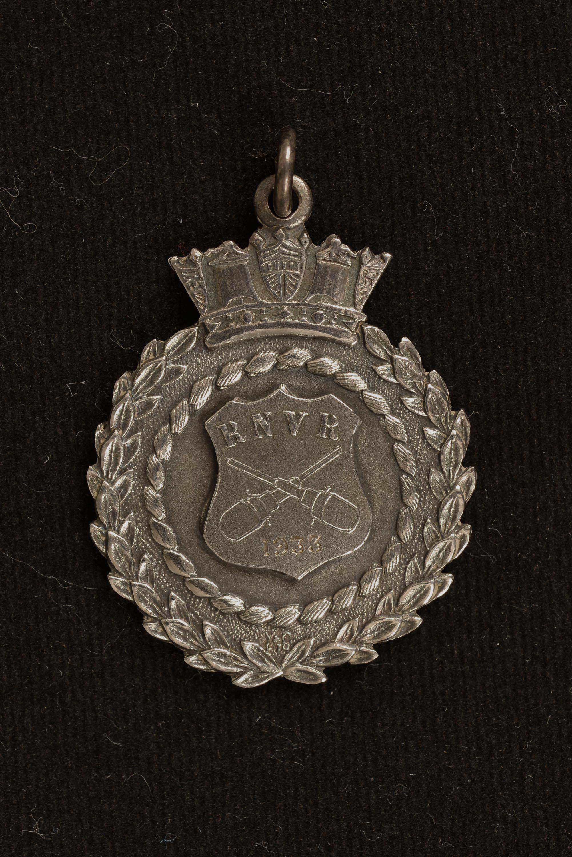 Silver medallion awarded to the winning team in gun drill competition held at the Auckland Volunteer Reserve Division base in 1933.
